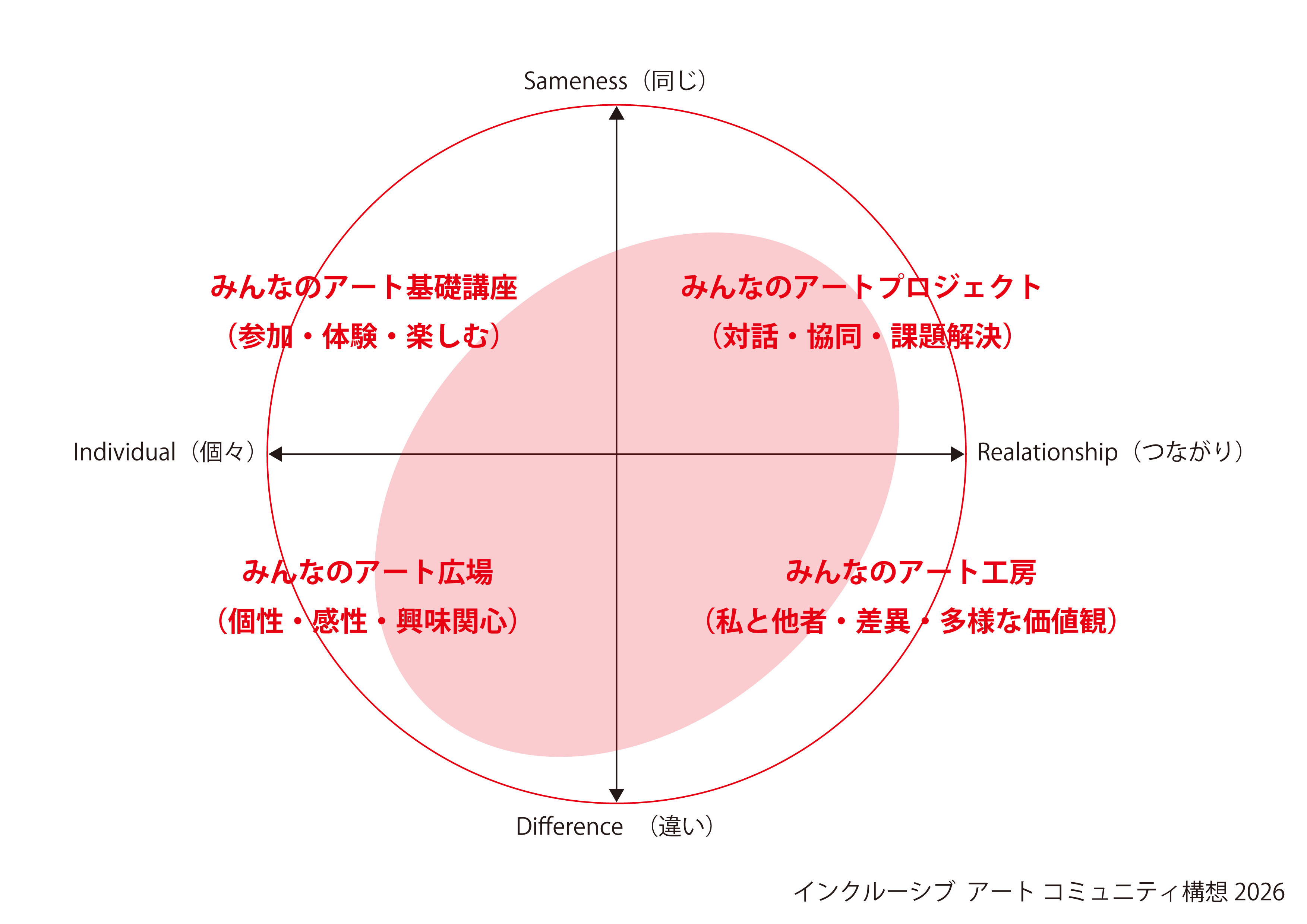 それは、全ての人々をやさしく包み込み(包摂=インクルーシブ)、同じ興味関心(=アート)のもと、一人ひとりの表現や考えが多様に響き合い、その差異を真摯に受け止め、自己を省み、そこでの学びを糧に明日に向かって力強く生きていける!その発着場(=コミュニティ)のようなイメージです。